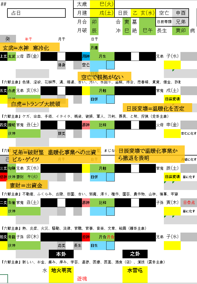 本卦は夜の卦、「地球温暖化」の科学的根拠が次々と覆されて、その正当性を失いつつある現況でしょう。