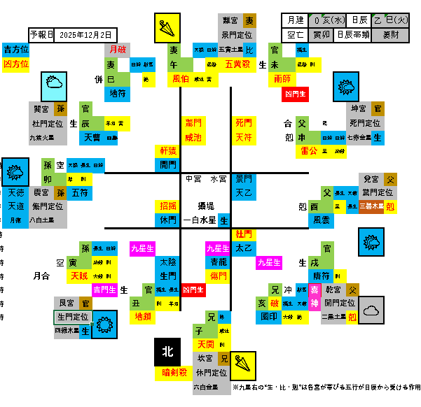 氣學・日盤及び時盤では、辰刻の北西、亥刻の南北に凶煞重なります。