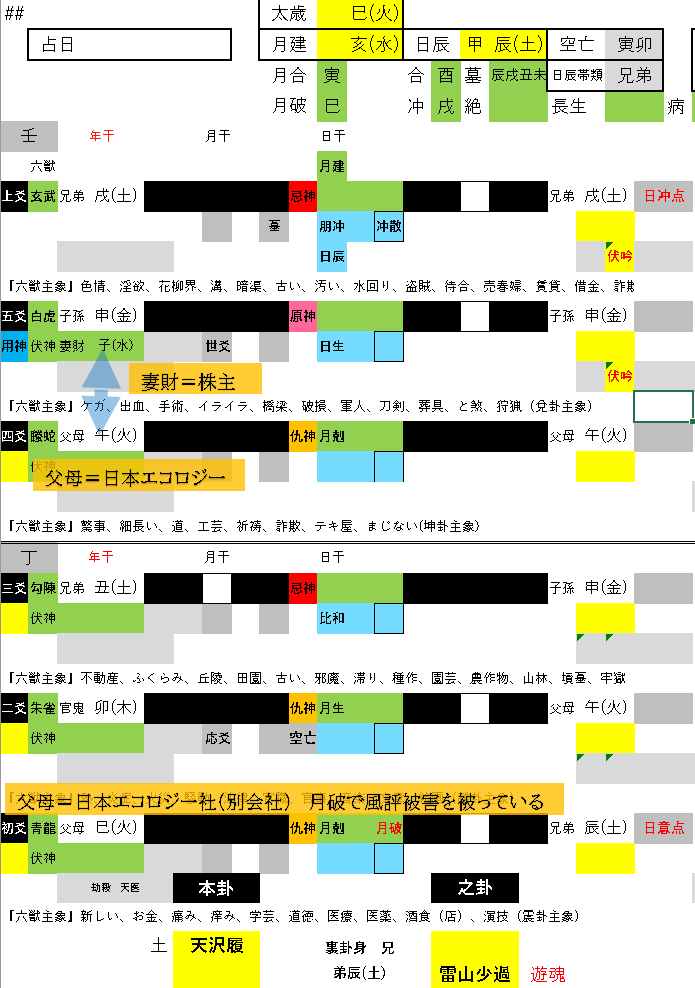 従って四爻の午(火)が「(株)日本エコロジー」で用神とは冲に関係となります。