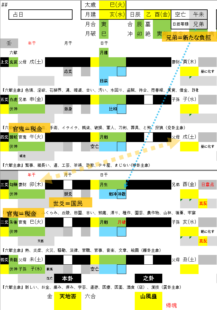 ただし、世爻を国民とすると、兄弟を帯びる日辰から冲を受けて冲散しています。世爻は妻財を帯びるので、国民が保有する金融資産、これが冲散するということは、あらたな負担が増え、ますます国民の財産が減じ、生活が困窮しそうです。