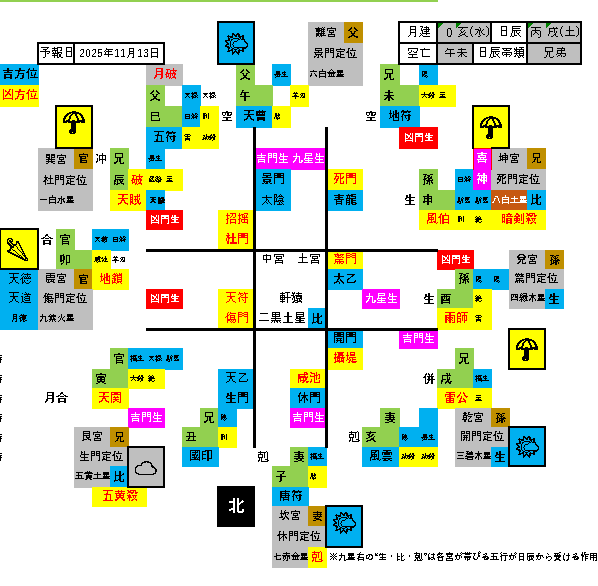 吉凶半々方位(生門旺相・五黄殺同会) お出かけした場合の方位事象…