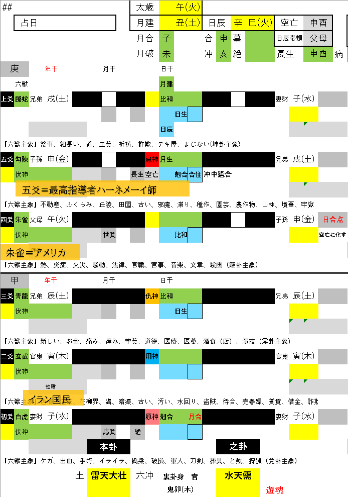 官鬼は二爻に現れていますが発動を見ません。ただし初爻をイラン国民と見ると、官鬼の原神を帯び月合と旺相していますから、確実に現体制に対する不満は現れてきているようです。