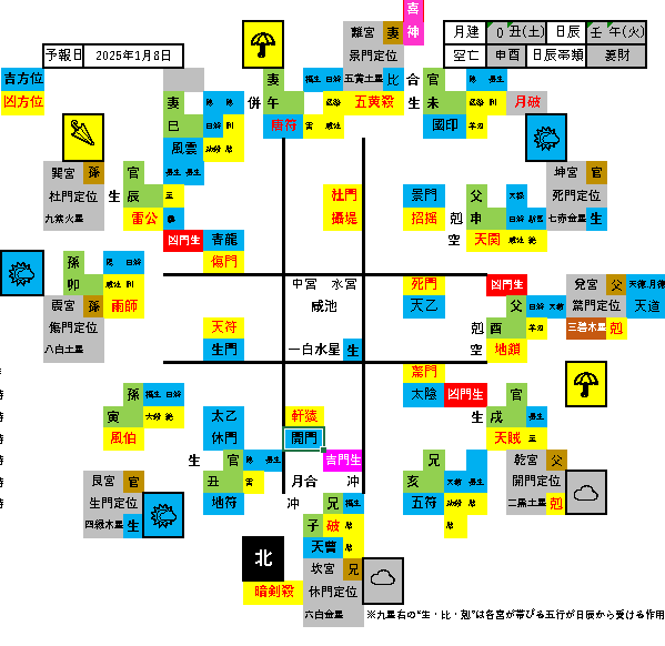 氣學・日盤及び時盤では、子刻と酉刻の南北、午刻の北に凶煞重なります。