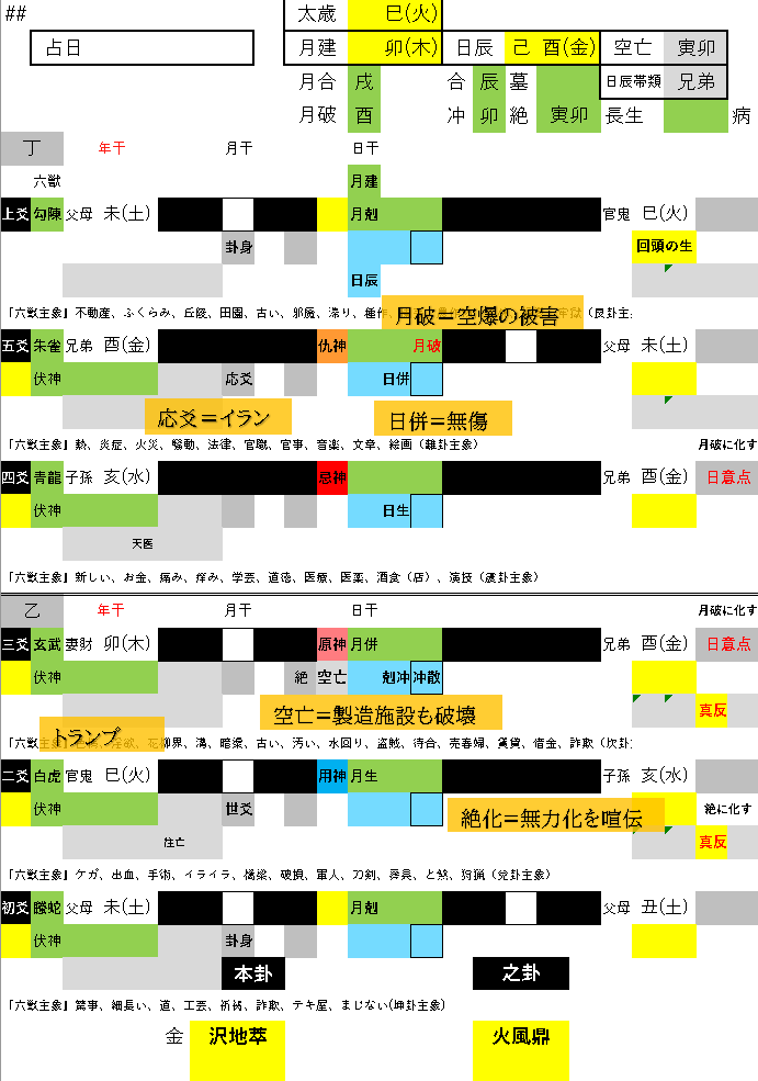 官鬼は二爻ではつどうしています。巳(火)が亥(水)に化すのは絶化という現象、これは「イランを無力化した」と豪語するトランプの様子でしょう。ちょうど二爻は白虎を帯び強気な発言をしています。内卦は反吟で繰り返すという様子。