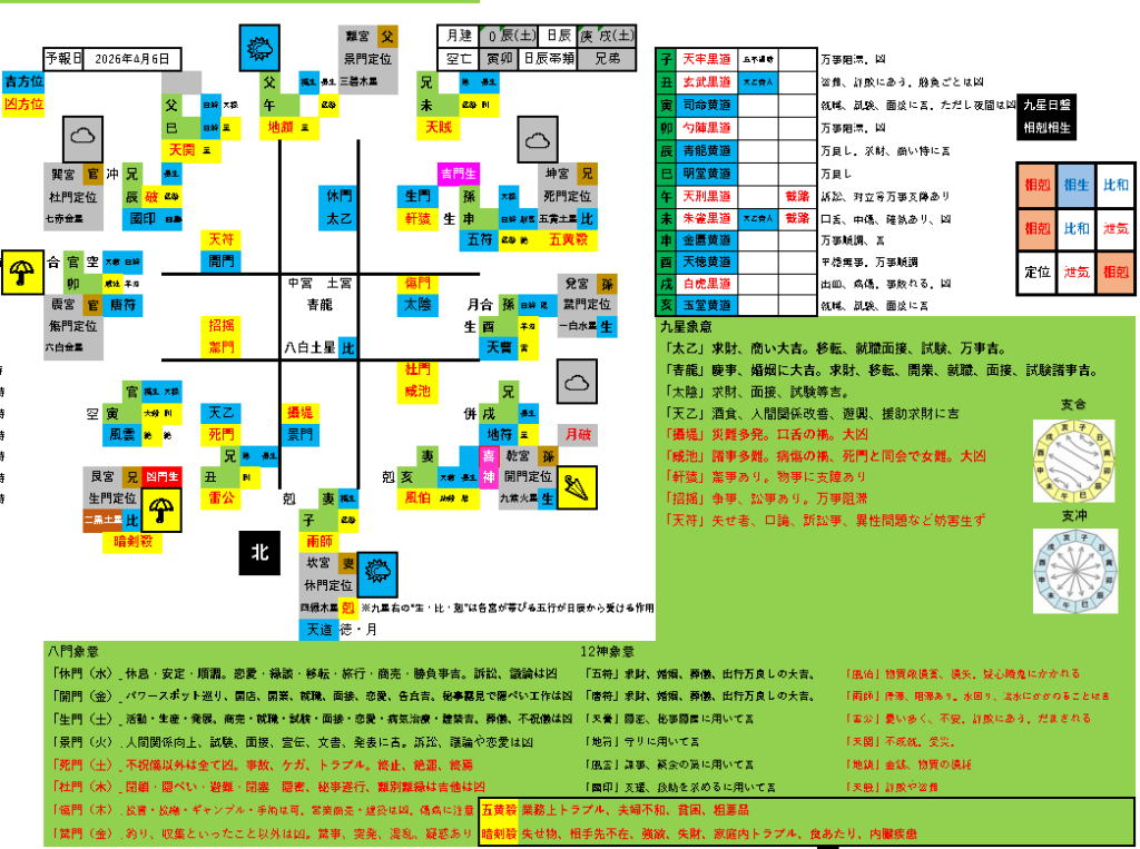 金運…やや凶。方位地支が兄弟と官鬼を帯び時刻が同会します。交友筋からの金策の無心、投資の勧誘などはお断りしましょう。貴重品の盗難や紛失にも要注意。お買い物、物欲が強くな地衝動買いしやすいです。ギャンブルは負けが先行、挽回しようと熱くなって、かえって散財します。
