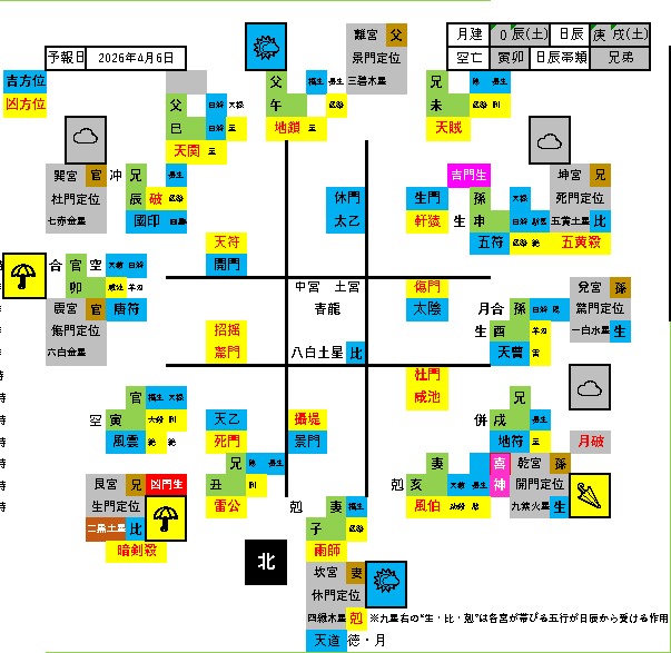 氣學・日盤及び時盤では、辰刻の北東と南西、申刻の北東、酉刻と戌刻の南東に凶煞重なります。