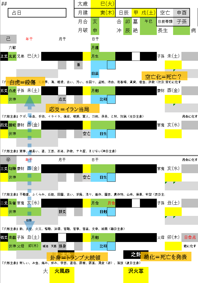 同時に五爻の兄弟が空亡しています。世爻が兄弟を化出しながら絶に化すという現象、同時に五爻は至高の尊位で、イランであれば国家元首の位置にあたります。