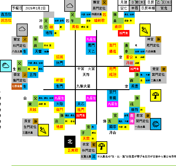 北☂️、北東🌂…北西🌤に方位除けが可能です。吉方位に移動後、現地への移動が東⛅となるように調整して方位除けを行いましょう。ただし北は凶意が強く、北西の吉意がやや弱いので、吉方位での滞在時間は長めにとり、現地への移動は吉刻を利用しましょう。