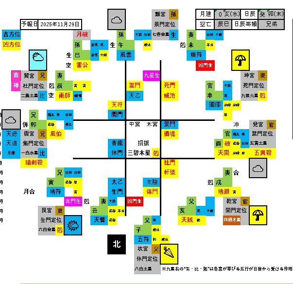 吉方位が東側に集中し、効果的な方位除けが難しい一日です。凶方位へのお出かけは、北東🌤、南東🌤の吉方位の運氣を取り入れて、吉刻を利用して移動するとよいでしょう。いずれの方位も凶意が強いため、滞在時間は短めに切り上げましょう。