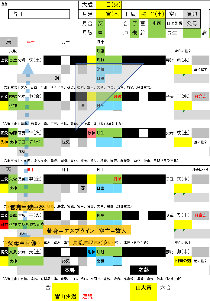 なぜなら外卦で寅午戌(火局三合)を形成、三合旺は官鬼で父母の原神となる三合です。また三合の一角をなす父母が上爻で戌(土)として現れ、応爻とは冲(ちゅう)の関係となります。また三合旺の官鬼午(火)は二爻と同じです。つまりここからやはりその死は偽装されていそうです。