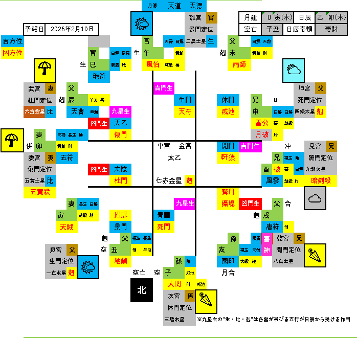 東☂️、南東☂️…北東🌤に方位除けが可能です。吉方位に移動後、現地への移動が南🌤となるように調整して方位除けを行いましょう。東は凶意が強いので、吉刻を利用して移動するとよいでしょう