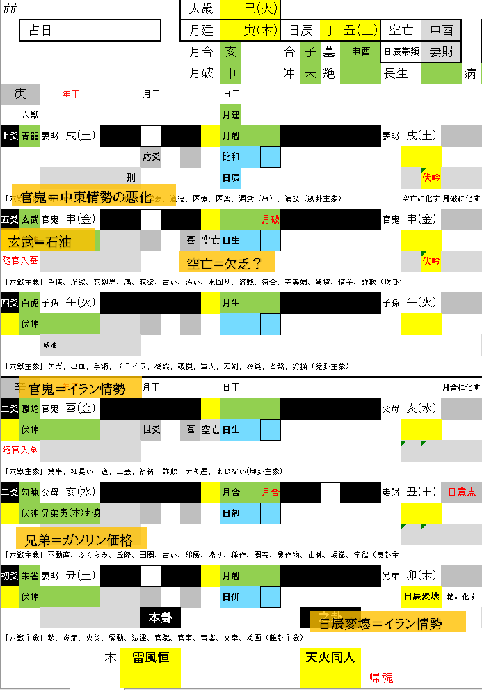 初爻で妻財(この場合原油を意味します)が日辰変壊を起こしています。朱雀(すざく)を帯び火の鳥から中東で上がる戦火を思わせ日辰変壊はイランによるホルムズ海峡の封鎖でしょう。