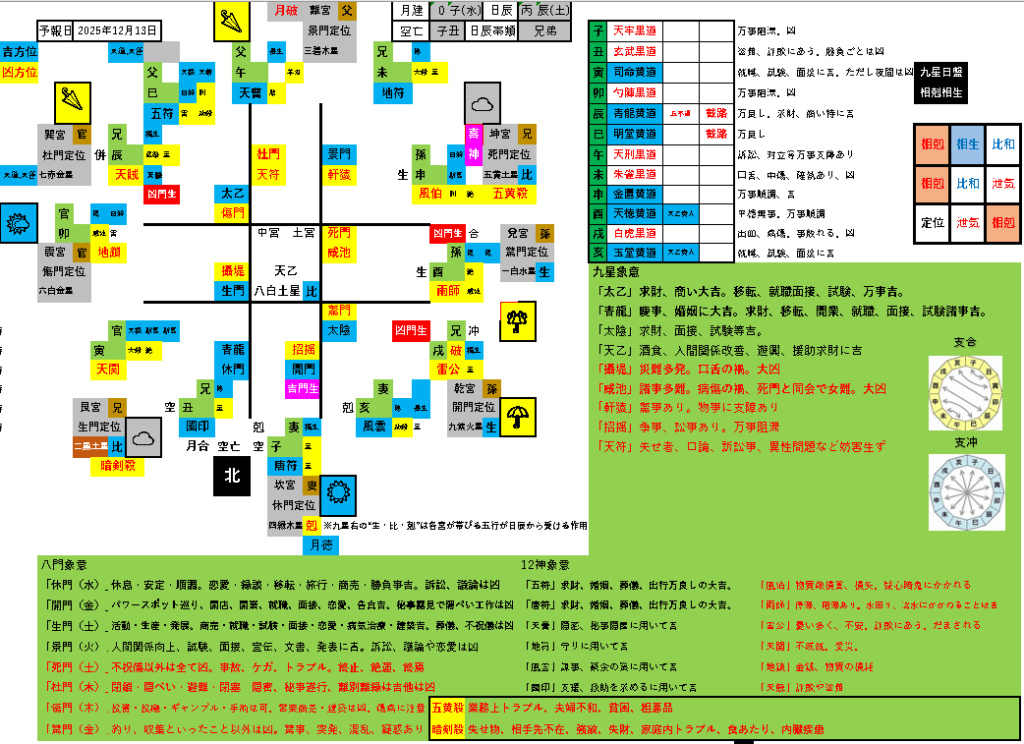 13日は、大きく崩れる本命星はありませんが、暗剣殺の重なる二黒土星注意日となります。(お出かけの有無に関わらず凶事発生しやすい一日となります)