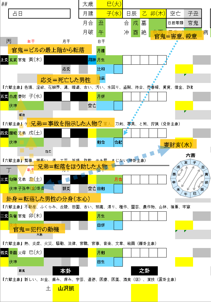 この3爻が官鬼の原神となる5爻と合の関係、妻財は月併と強い作用を受けていますから、4爻の人物の支持を受けた3爻が被害者男性をビルの最上階から転落させたというのが事件の真相でしょう。