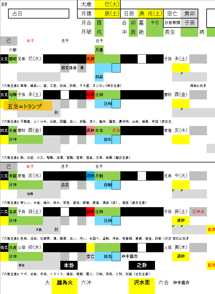 五爻をトランプとすると、官鬼を剋す子孫を帯び発動を見ますから、なんらかの治療を受けた様子が伺えます。