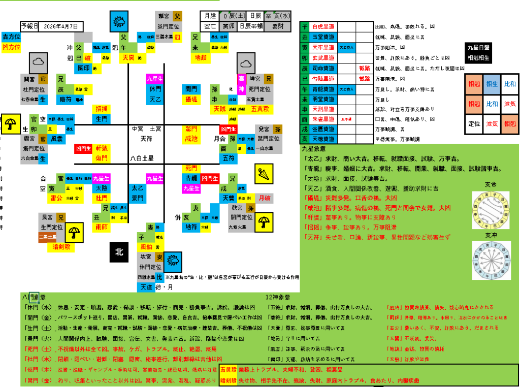 金運…やや凶。方位地支子孫と官鬼を帯び一白水星が同会します。ギャンブル運勘が冴えるので勝つこともありますが、番狂わせが多く出入りが激しいでしょう。お買い物は見えないところに傷があったり、不良品が多いので、購入前にチェックしましょう