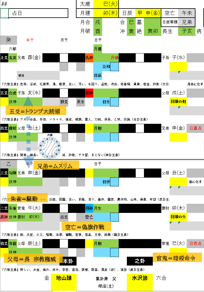 占断としては、近日中にトランプに対するなんらかの害意、大統領の身に害意が向けられる事件が発生しそうです。そしてそれはムスリムの仕業とする「偽旗作戦」である可能性が高い。