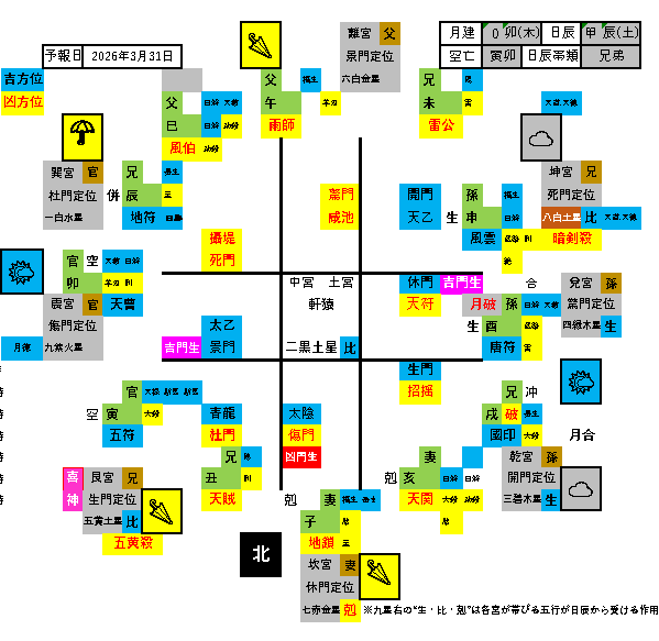 氣學・日盤及び時盤では、辰刻の北東と南西、及び北西、巳刻の北西に凶煞重なります。