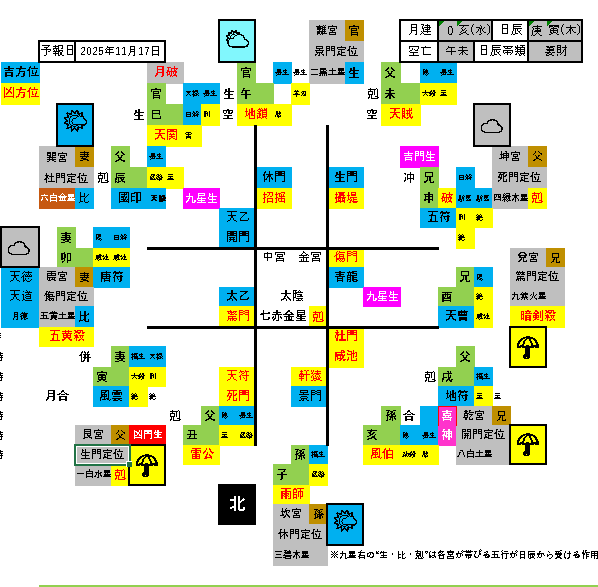 西☂️、北西☂️…効果的な方位除けが難しい方位となります。北🌤の吉方位にどうして吉運氣を取り入れてから、吉刻を利用して現地に移動するとよいでしょう。