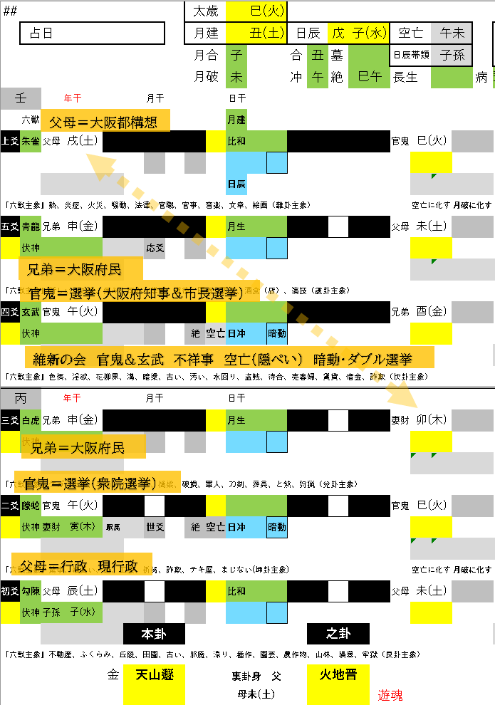 上爻は朱雀を帯び、宣伝という象意から、盛んに「大阪都構想」を宣伝している様子がうかがえます。