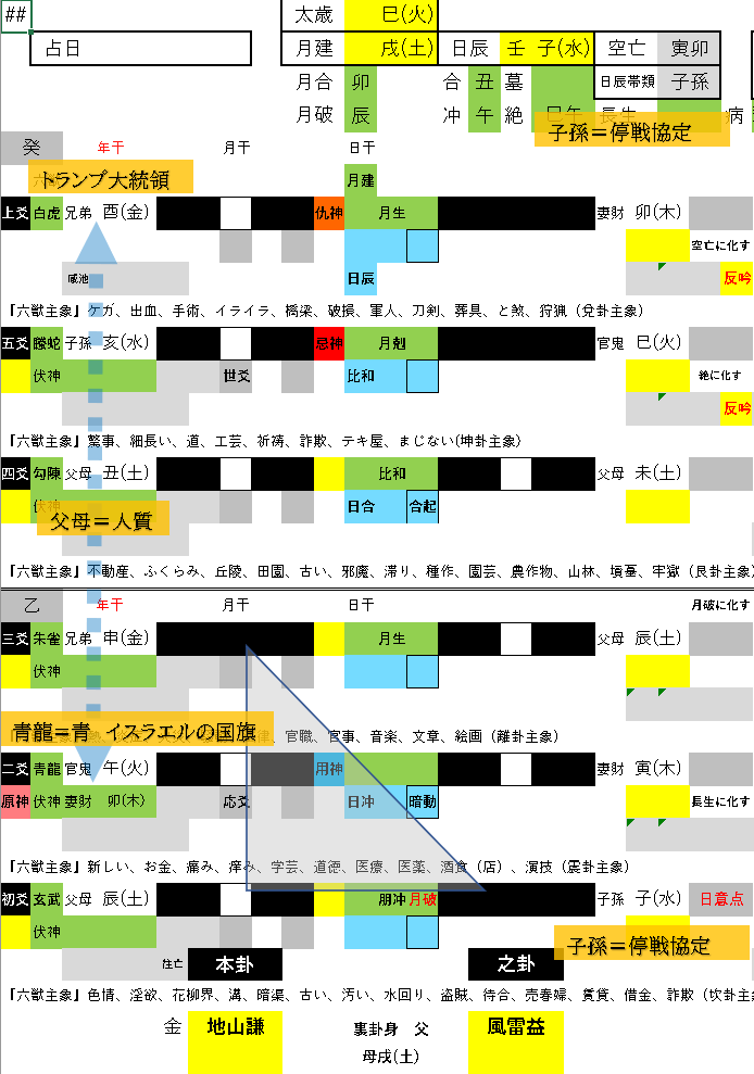 そして4爻は日辰からご応されて合起。これはハマスの動きで、停戦合意に基づき、人質の解放に向けて準備を進めている様子でしょう。日辰帯類は子孫なので、停戦合意の条件の履行が合起です。