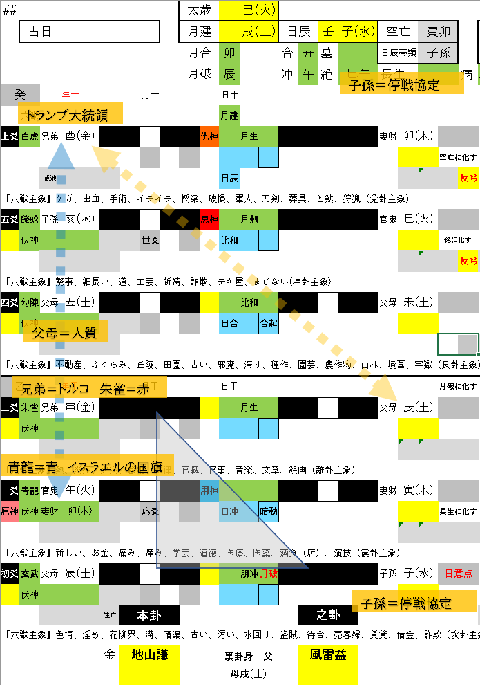 そして付帯する朱雀は赤ですから、これがトルコを表していそうです。化出父母の辰は上爻と合の関係となるので、アメリカの同盟国という情報を強めます。