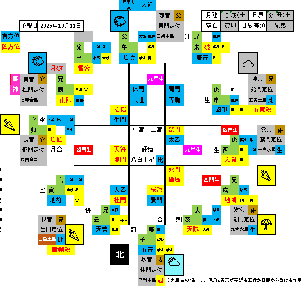 東🌂、北東🌂…南東🌤に方位除けが可能です。吉方位に移動後、現地への移動が北⛅となるように調整して方位除けを行いましょう。北東は凶意が強いので、吉方位での滞在は長めに取り、吉刻を利用して現地に移動するとよいでしょう。