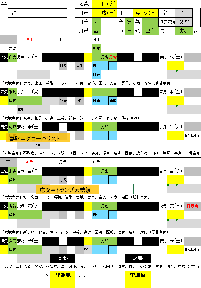 二爻の父母が日併と強力です.月建から剋を受けるものの日併はこれを覆す好作用であり、トランプ大統領の支持を受けて政権基盤を盤石なものとする高市政権を表していそうです。青龍は高市早苗が好むトレードカラーです。
