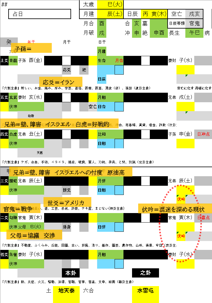 4爻の兄弟がイスラエルです。発動を見ませんが、白虎を帯び好戦的な様子。そして丑は金局の墓にあたりますから、停戦協議そのものを墓に納める、この場合曖昧にして戦争の継続を望んでいるように見えますが、一方で停戦を切望しているのはイスラエルの様です。