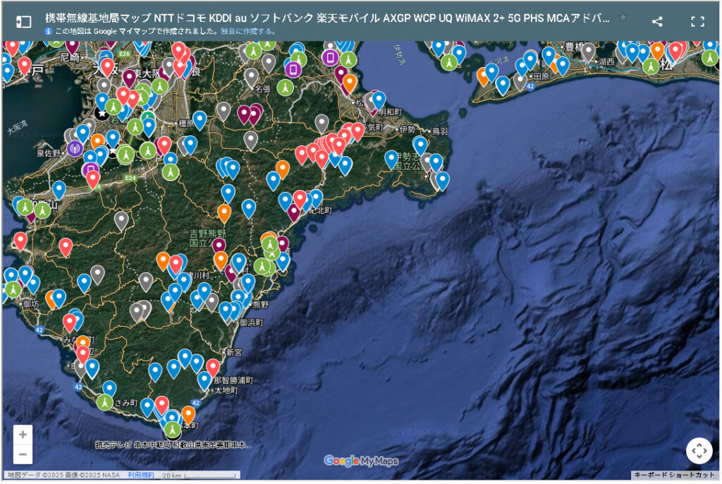 同じくX上で公開されている目撃情報と三重県のアンテナ及び基地局の設置状況を調べてみるとこんな感じです。