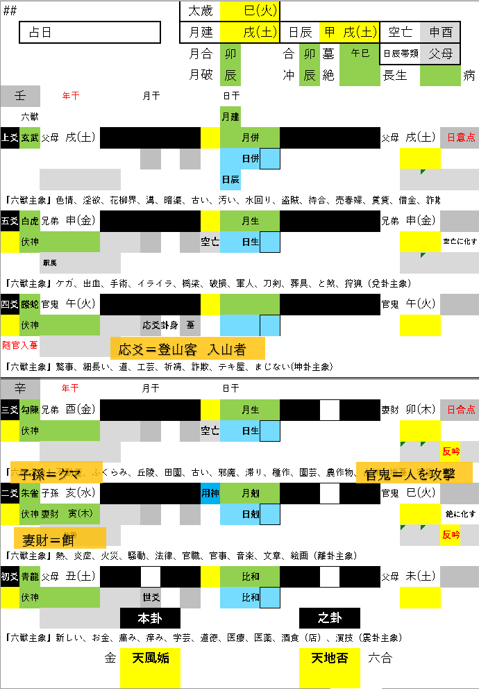 応爻を八ヶ岳に入山する登山客、あるいは山菜やキノコを採りに入る人とすると、応爻は官鬼(かんき)を帯びていますから襲われる様子と見ることができます。