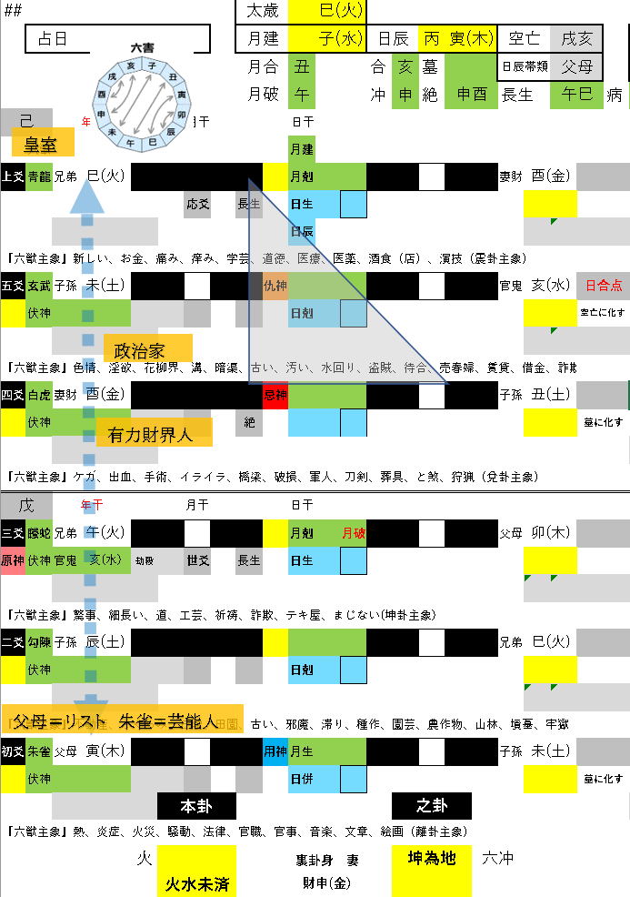 一方で5爻は亥卯未(木局三合)の木局墓です、従ってリストの中に政治家の名前も挙がってきそうです。