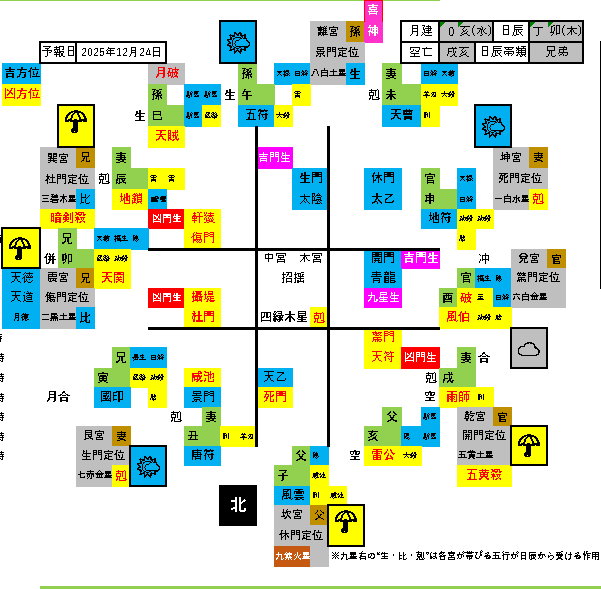 北☂️、北西☂️…効果的な方位除けが難しい方位です。最大吉方の南☀や、南西🌤の吉方位を利用して吉運氣を取り入れてから、吉刻を利用して現地に移動するとよいでしょう。