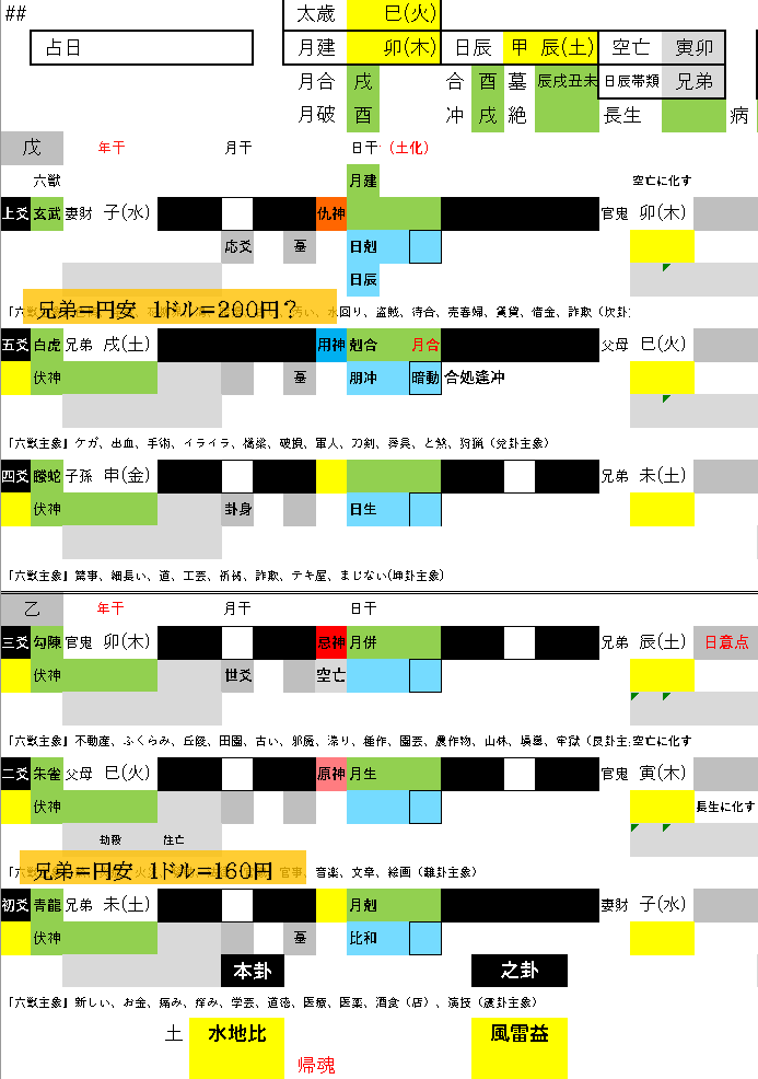 初爻を1ドル=160円とすると、2爻=170円、3爻=180円…で、兄弟の戌=10月で秋には1ドル=200円を突破するかもしれません。