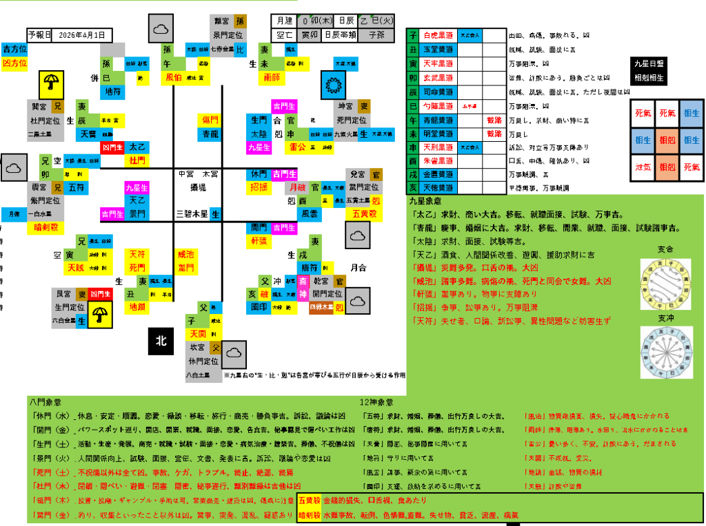 吉方位が限定され、効果的な方位除けが難しい一日です。一度南東☀の吉方位に移動して、吉運氣を取り込んでから、吉刻を利用して現地に移動するとよいでしょう。