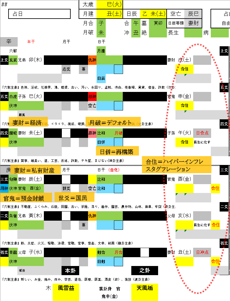 内卦は卦の合住を起こしています。すでに始まっている物価高。そして外卦も卦の合住を起こしていますから、内外の合住は、ハイパーインフレ、あるいは不況と物価高が同時進行するスタグフレーションを意味していそうです。