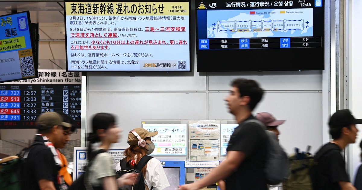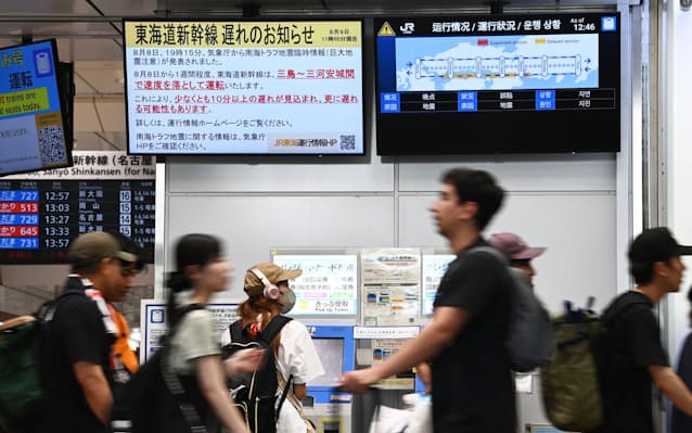 南海トラフ地震臨時情報が発表され、東海道新幹線に遅れが生じたことを知らせる駅構内のモニター(9日、JR東京駅) 南海トラフ地震の臨時情報「巨大地震注意」が初めて発表され、これから本格化するお盆休みは地震への備えを求められる。帰省や行楽での移動が10日からピークを迎える一方、東海道新幹線や特急、在来線の一部が速度を落とすなど交通機関にも影響が出ている。専門家らは旅先の避難場所を事前に確かめるよう呼びかけている。