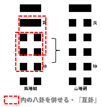 一方で3爻=陰爻(- -)、4爻=陰爻(- -)、5爻=陽爻(—)で艮の八卦が導き出せます。この二つを組み合わせると「山地剝」の卦が得られます。