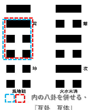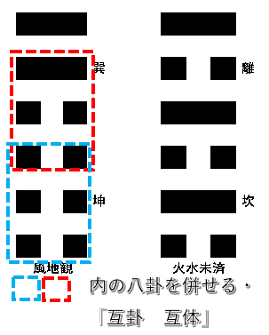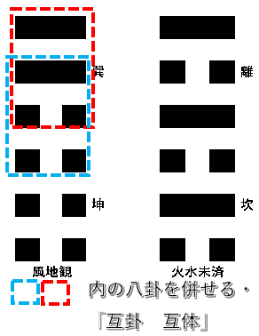 互卦とは、得た卦象の2爻、3爻、4爻で内卦を取り、3爻、4爻、5爻で外卦を取って別の卦象を導き出します。