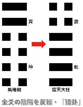 風地観の初爻から4爻の陰爻(- -)を陽爻(—)に、一方で5爻、上爻の陽爻(—)を陰爻(- -)に反転させます。すると「雷天大壮」という卦象となります。