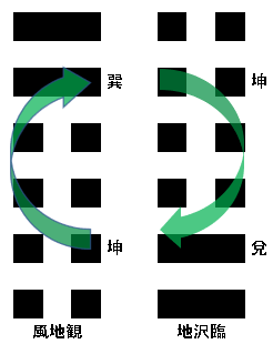 もちろんその卦象は風地観とは異なります。上爻から風地観を眺めると「地沢臨」という卦象になります。