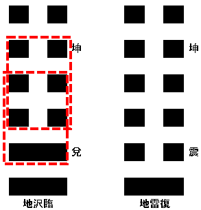 互卦を取るならば、2爻の陽爻(—)、3爻の陰爻(- -)、4爻の陰爻(- -)を内卦とする震、3爻の陰爻(- -)、4爻の陰爻(- -)、5爻の陰爻(- -)を外卦とする坤で「地雷復」という卦象となります。