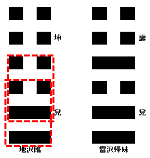 あるいは互体を取ると、内卦の兌に2爻、3爻、4爻の震で「雷沢帰妹」の互卦が取れます。