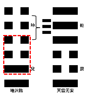 例えばここで外卦の坤の陰陽を反転させると乾となり、ここで2爻から4爻までの震で卦象を組み立てると天雷无妄となります。