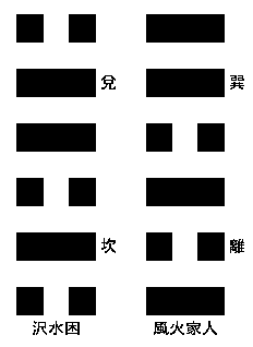 例えば、本卦に「沢水困」、之卦に「風火家人」の卦を得たとしましょう。