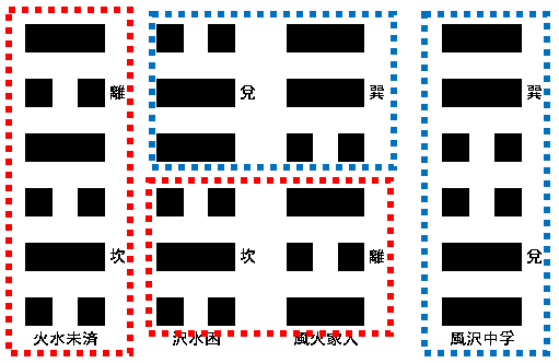 沢水困の内卦は坎、風火家人の内卦は離ですから、内卦同士で出来上がる卦は「火水未済」となります。