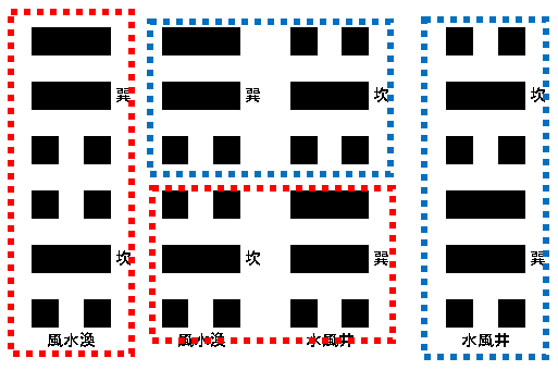 例えば本卦・風水渙、之卦・水風井で内卦同士、外卦同士で先ほどと同様に卦象を組み立てると内卦同士では風水渙、外卦同士では水風井となってしまい、本卦之卦と全く同じです。