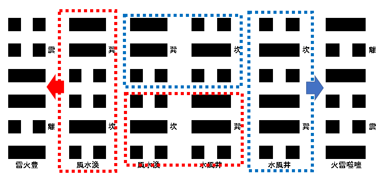 このように風水渙の錯卦「雷火豊」が内卦のプロセスにあり、水風井の錯卦「火雷噬嗑」が外卦のプロセスにあると考えます。