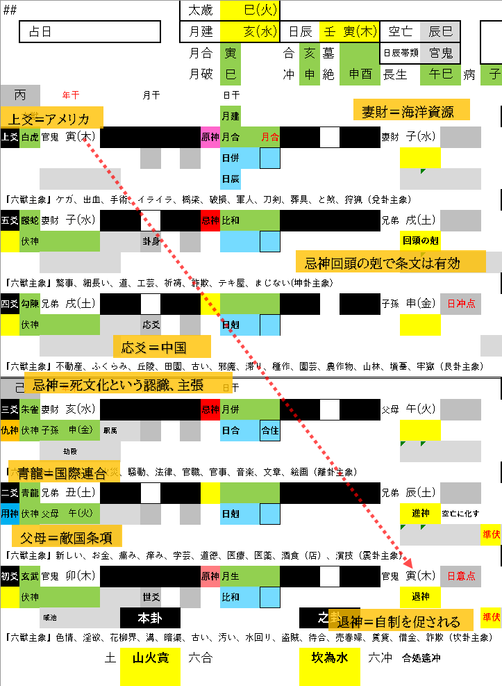 更に忌神が5爻に現れますがこちらは回頭の剋ですから、仮に中国が敵国条項は有効と主張した場合、これを覆すだけの論拠がない様子。