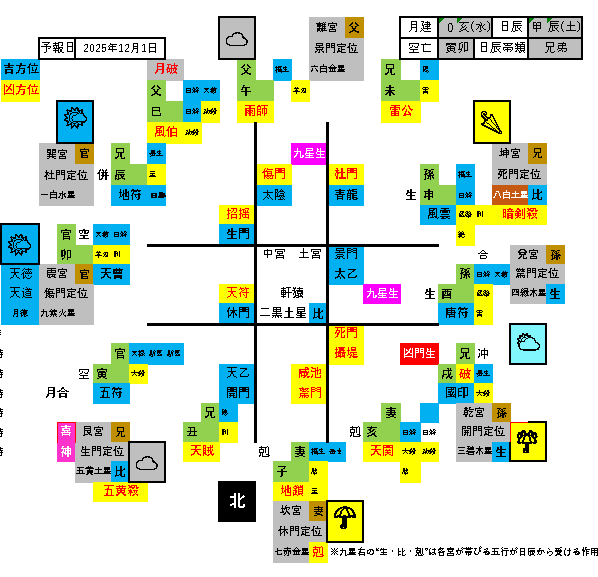 氣學・日盤及び時盤では、辰刻の北東、南西及び北西、巳刻の北西に凶煞重なります。
